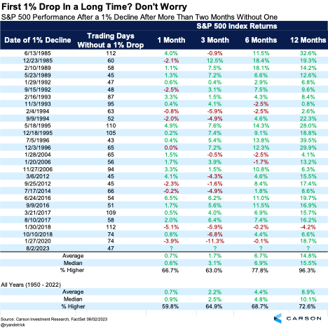 In fact, the day of the downgrade the S&P 500 fell 1.4%, marking the first 1% decline in more than two months. After a five-month win streak and historically low volatility, we think investors should buckle up for possible big swings. The good news is that, historically, when the S&P 500 goes more than two months without a 1% decline and then finally has one, higher prices typically follow. In fact, since 1980, the S&P 500 was higher a year later 26 out of 27 times and up a very impressive 14.8% on average. While some of the near-term returns can be rocky, longer-term better returns are typically normal.