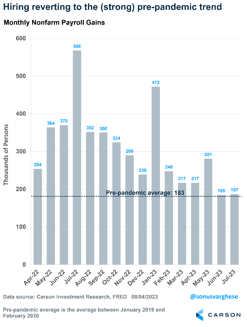 The economy created 187,000 jobs in July, which is slightly softer than the 200,000 that economists expected. The last couple of months were revised lower, which is why it is helpful to review the three-month average. That figure is now 218,000, which is stronger than the pre-pandemic average of 183,000.