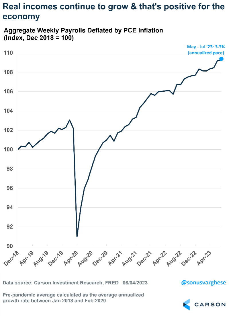 The U.S. economy runs on consumption, and for that we need income. Encouragingly, income growth remains strong and is running ahead of inflation. In fact, wage growth rose 0.4% in July. Monthly numbers can be volatile, but the three-month annualized pace is 4.9%.