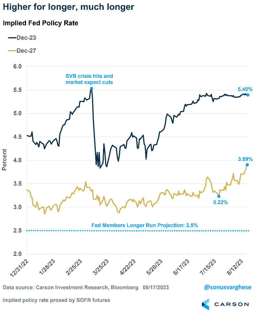 Rising long-term yields mean investors expect the Fed to keep rates on the higher side long-term. The run of strong economic data, including employment, has surprised many investors. As a result, expectations for future growth are shifting higher as the economy proves its resilience in the face of an aggressive Fed and higher interest rates.