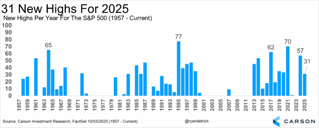 Including last week, we now have 31 new all-time highs in 2025. In fact, 2025 already ranks 20th for the number of new all-time highs, not bad considering we still have nearly three more months to go.