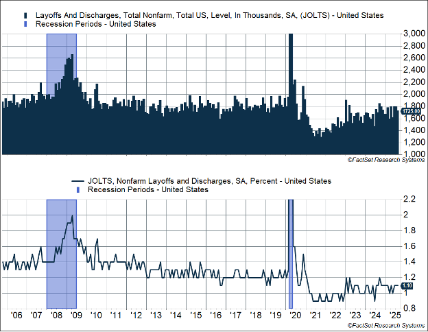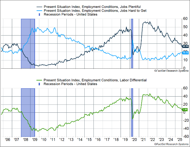 The difference between the two is called the “Labor Differential Index,” fell 3.3% points to 7.8%, the lowest level since February 2021. The labor market differential is well below peak levels we saw in 2021–2022, and also below 2018–2019 levels. Even beyond the absolute level, the trend just does not look good. But this is being driven by a weak hiring environment, rather than layoffs.