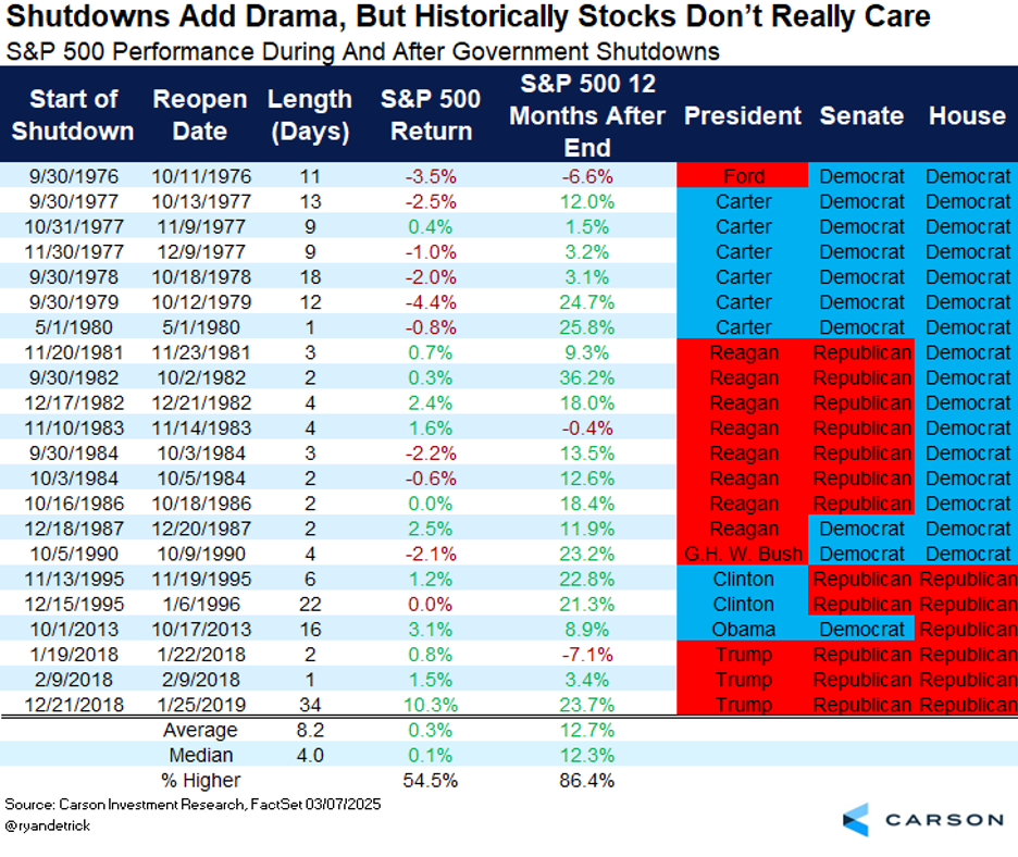 We’ve written about the impact of shutdowns on markets, and historically there really isn’t one. In fact, the last shutdown, in 2018–2019, was a record 34 days and stocks gained more than 10%! Most shutdowns last only a few days, so just long enough to get into the headlines, and then they’re over just as quickly.