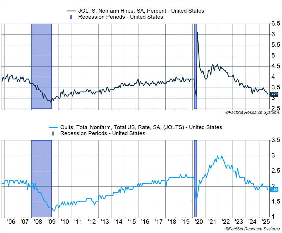 Hiring has consistently been the worst part of the labor market since 2023, but we had seen some stabilization earlier this year. The problem is that things have gotten worse over the last three months. The “hiring rate,” which is hires as a percent of labor force, fell to 3.2% in August, matching the post-Covid low. This is the weakest pace of hiring since early 2013 (ex Covid). For perspective, the average hiring rate in 2019 was 3.9%. The big picture is that hiring has eased a lot since 2022 and early 2023. It appeared to have stabilized between mid-2024 and mid-2025, but things have gotten worse on the hiring front since June, with a visible downtrend.
