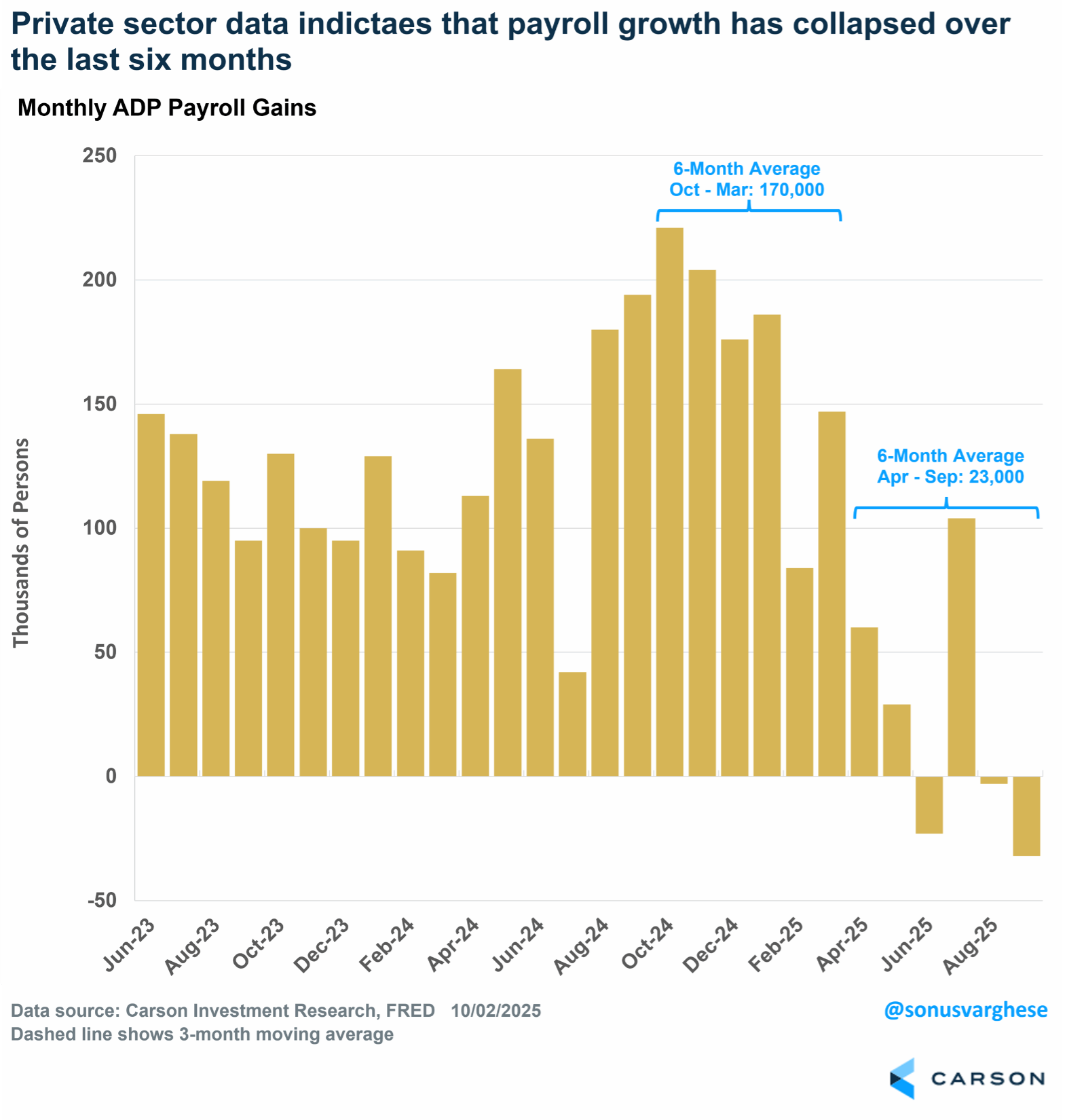 Another dataset that has been popular in the absence of official data has been a report from Revelio Labs, which tracks LinkedIn profiles. Their data has been much more upbeat, showing September payrolls increasing by 60,000. The six-month average (April–September) is 28,000, which is not a huge slowdown from the prior six-month average (October–March) of 44,000. The problem is that they use a 12-month average to smooth out the data, so any sharp changes on the ground may not be picked up immediately.