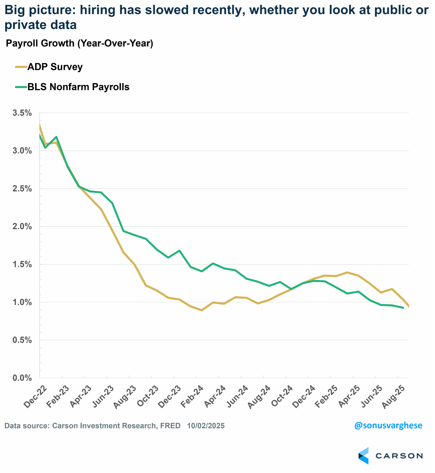 This one can vary quite significantly from the BLS report, and it usually comes out a day ahead. Of course, it’s especially handy when the official data is not forthcoming. It’s mostly useful to gauge the trend of what’s happening in the labor market, and that typically matches what we see in the official data. And right now, the trend is down, whether you look at payroll data from the BLS or what ADP reports. As of September, ADP payrolls have grown just 0.9% year over year (matching the BLS payroll growth rate in August). In 2024, year-over-year growth was 1.3% for both surveys.
