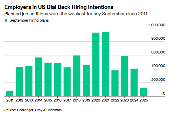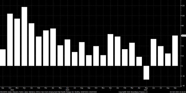 At the same time, Challenger data indicated that companies announced plans to cut 54,064 jobs in September. That’s down 26% from last year and below the 86,000 announced in August. Year to date, employers have announced plans to cut 946,00 jobs, the highest year-to-date total since 2020 (though some of these “planned cuts” don’t materialize). Cutbacks have been highest in the government sector, with DOGE-related reductions of 289,000. This could increase in October if the Trump administration goes through with their threat of firing thousands more government employees amid the shutdown.