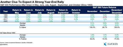 Remember when the media meme machine told you to “Sell in May and go away”? Well, there is data to back it up (even if “go away” isn’t the right answer, as we discussed back in May). Historically the six months from May through October in fact are the weakest six consecutive months of the year (chart on that below), but that sure wasn’t true this time! In fact, the S&P 500 gained all six months for only the fourth time ever, joining 1958, 1980, and 2017 in the record books. But even more incredible, the S&P 500 is up more than 22% during these historically weak months, the best “Sell in May” return ever!