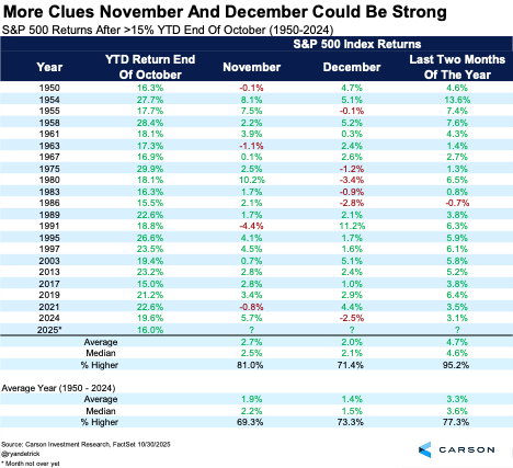 Now we find ourselves in November, which historically is a very strong month and kicks off a run of some of the strongest months of the year. Yes, we’ve seen a huge rally into this usually bullish period, but does that mean the bull will tire? Maybe not, as we discuss below.