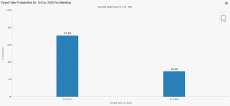 Investors were quick to reprice the odds of a December cut. The probability of another cut in six weeks fell from over 90% to about 70%.