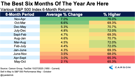 Here’s a nice table that shows that indeed May through October is the worst six months for the S&P 500 historically. But that means the next six months are the best, up 7.0% on average and higher 76% of the time.