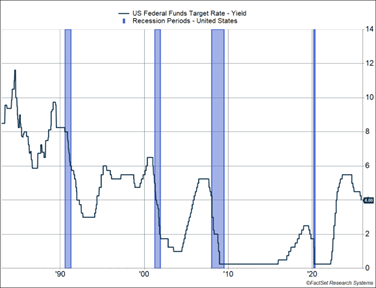 The Federal Reserve (Fed) cut rates by 0.25%-points at their October meeting, as expected. The target federal funds rate is now 3.75–4.50%, 1.5%-points below the peak of this cycle, and the second cut in consecutive meetings. The chart below shows the upper end of their target. This is now the largest set of cuts we’ve seen outside of a recession since the mid-1980s. Even in the 1995–1999 period, the Greenspan Fed only cut rates by 1.25%-points (though they raised it by 0.25%-points in 1997). But keep in mind that this is following the most aggressive rate hikes since the 80s.