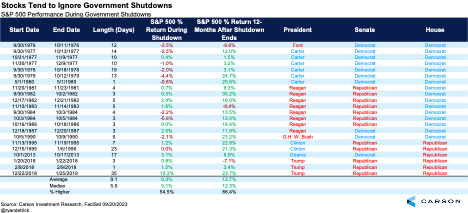The legislation buys time for Congress to reach an agreement on spending over the next year. This is going to be a steep challenge, but for now the government will stay open and there will be no immediate impact on the economy. Note that markets have historically taken previous shutdowns in stride, as investors know the government will reopen eventually. As we noted last week, stocks have been higher during previous shutdowns, and stocks gained more than 10% during the last shutdown.