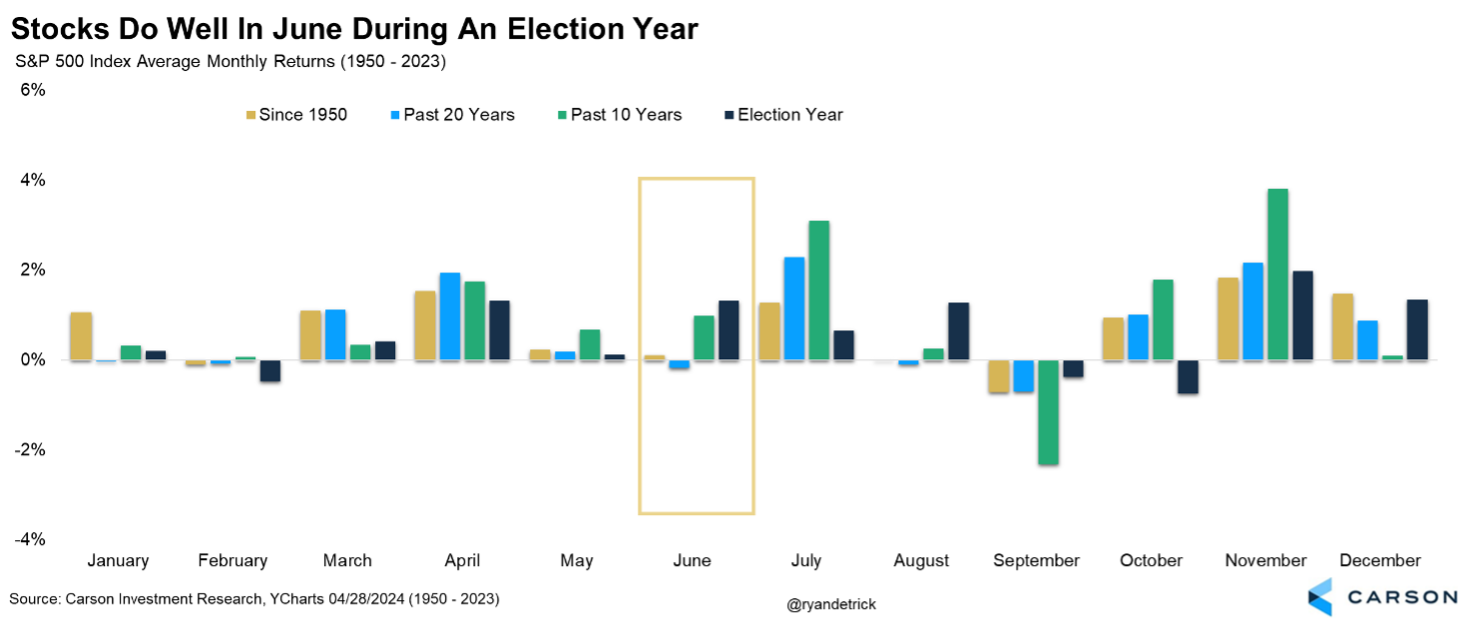 - While June is historically a weak month, it fares much better in election years and a strong May suggests strength in June, the rest of the year, and even over the next 12 months.
