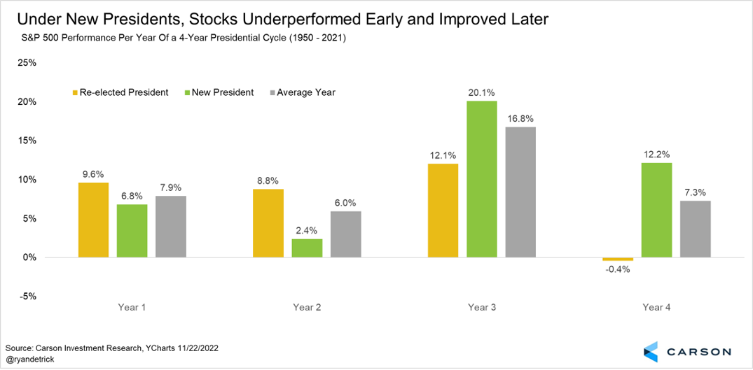 We’ll leave with this chart. It turns out that the second year of a new president’s term is quite weak historically for stocks, which sure played out in 2022. But the third year of a new president’s term is historically the best scenario for stocks, as the S&P 500 is up more than 20% on average. We wouldn’t give up all hope just yet on 2023, as the stage could be set for much better times.