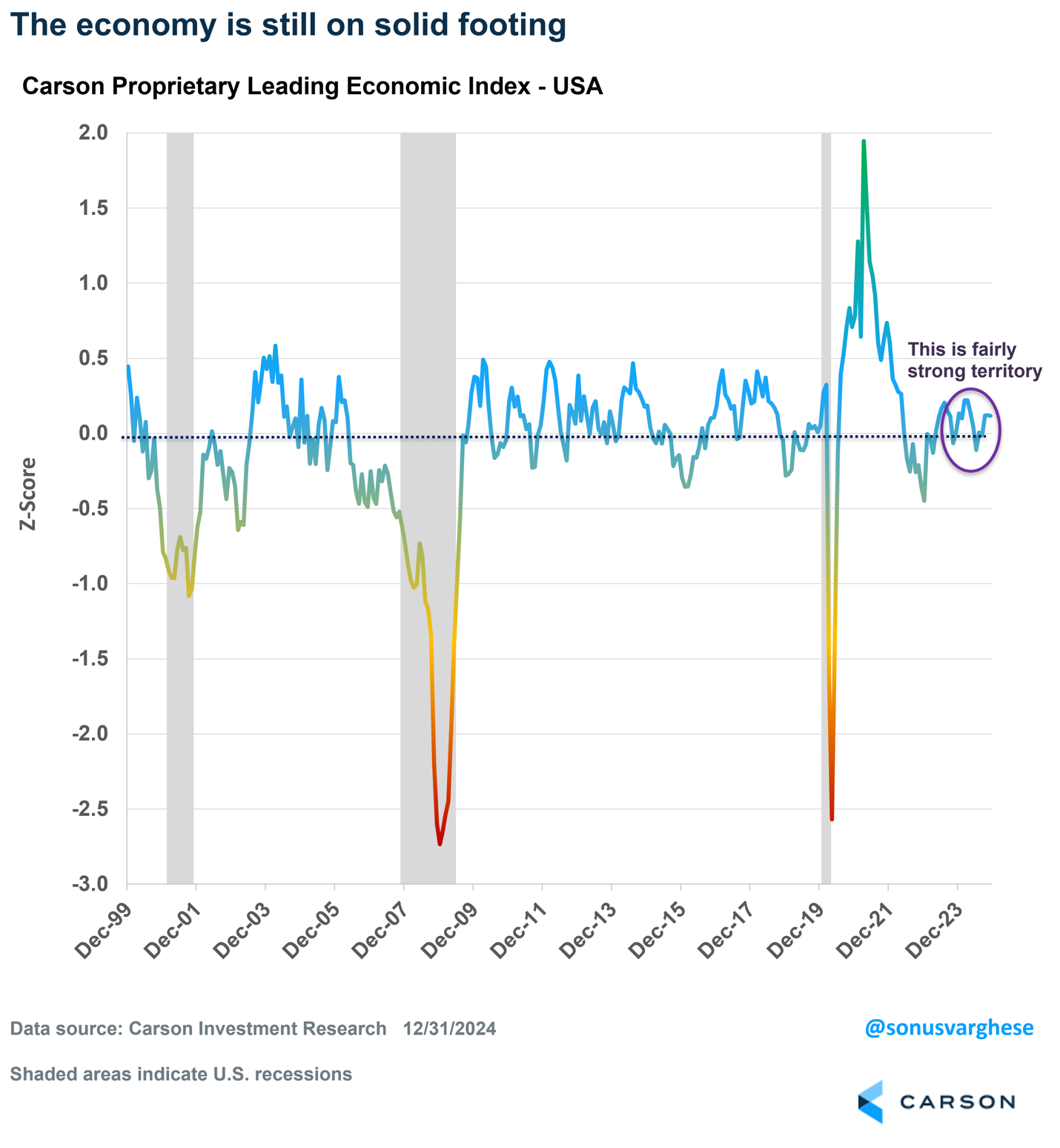 Our proprietary Carson Leading Economic Index (LEI) for the U.S. never pointed to recession at any point over the last two years, and it’s still in strong territory as we start 2025 (in contrast to other popular leading economic indicators). The Carson LEI includes more than 20 components that capture the dynamics of the U.S. economy, including consumption, housing, business and manufacturing activity, sentiment and financial markets. We populate an LEI for 28 other countries as well and aggregate it all together to get a picture of the global economy as well as major regions. Right now, the U.S. stands tall above almost every other major economy in the world.
