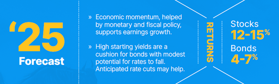 Overall, economic strengths clearly outweigh areas of weakness, and the opportunities likely have a higher probability of coming to fruition than the threats. We believe that economic momentum, an easing Federal Reserve and pro-growth fiscal policy will continue in 2025, but we may also get a lift in the national mood that economists call “animal spirits.” With that, here’s our forecast:
