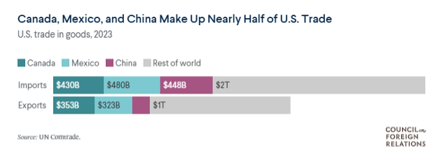These tariffs, assuming they are imposed, are significant. Even if it doesn’t happen, the cloud of uncertainty is something businesses will have to deal with. If it does happen, that would be quite a shock — much larger than all the trade actions taken in Trump’s first term. Canada, China, and Mexico make up about 43% of US goods imports, and about 41% of US export destinations, as this chart from the Council of Foreign Relations (CFR) illustrates.