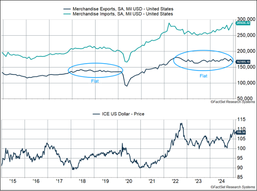 Over the last two years, exports have been flat amid an elevated dollar. Q4 2024 was especially bad — real goods exports fell 5% (annualized), pulling real GDP growth down by 0.4%.