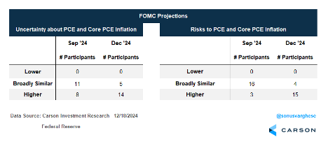 After positive consumer inflation data came out a few weeks ago, we wrote that the inflation outlook still looked good. Fed Chair Jerome Powell himself said the same thing after their meeting last week. He was surprisingly positive about the inflation outlook. At the same time, the Fed is increasingly concerned about inflation uncertainty. That is why they got hawkish in December. In the first post-election Fed meeting, they cut rates by an additional 0.25%, but their projections showed just 2 cuts in 2025 (versus the prior projection of 4 cuts). Also included in the projection, 14 of 19 members thought inflation uncertainty was higher and 15 thought inflation risks were “weighted to the upside”. These are big shifts from their September projections, as you can see below.
