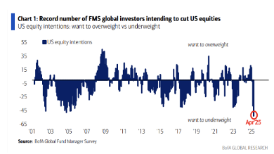 The recently released Bank of America Global Fund Manager Survey showed a record number of participants who intend to cut US exposure, as shown in the chart below. The survey also showed the largest two-month jump in cash since April 2020 and the fourth-highest recession expectation ever. Given the fact that this survey looks at financial professionals who manage portfolios, this is a very solid potential contrarian indicator.
